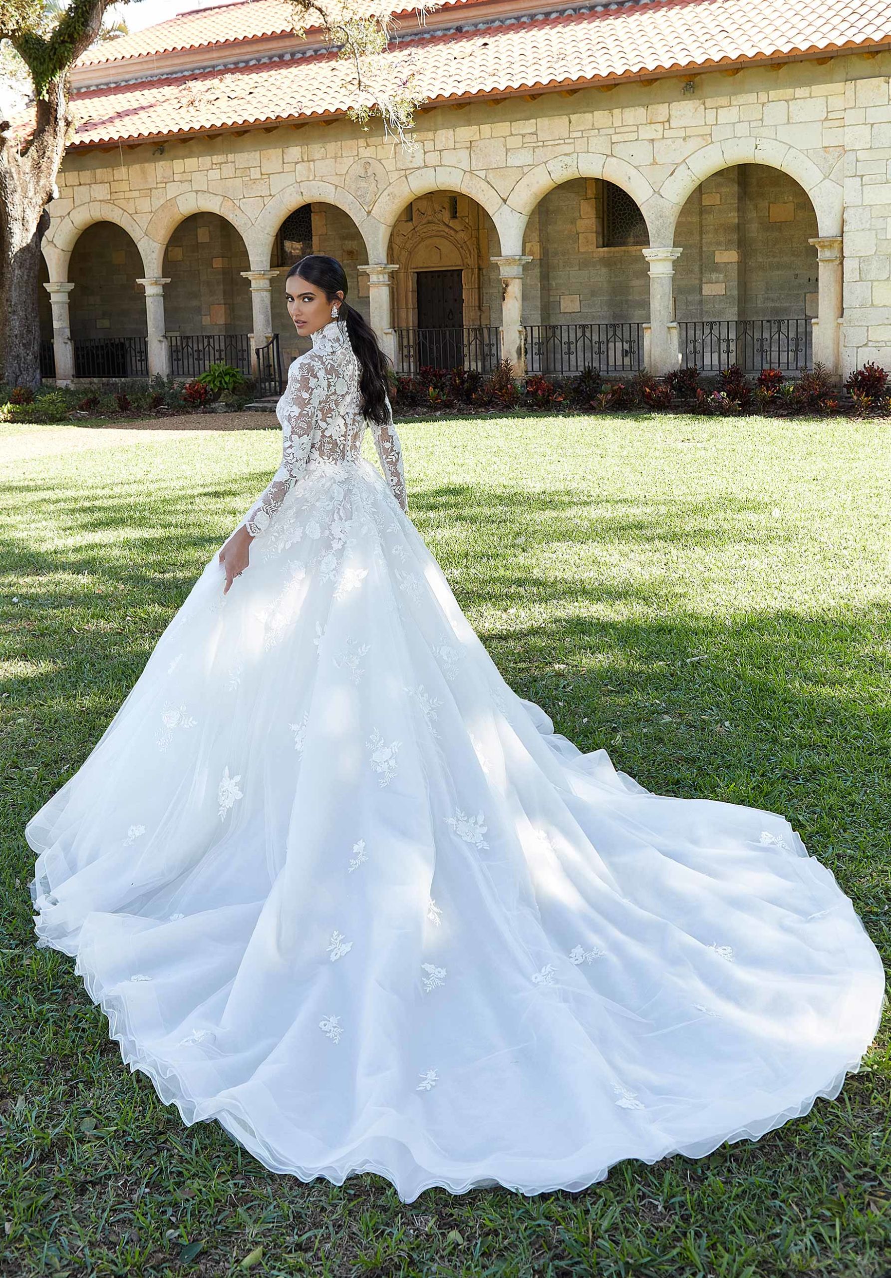 Grand ball gown has striking oversized floral lace decorating the illusion high neck bodice and long sleeves cascading down the full tulle skirt.