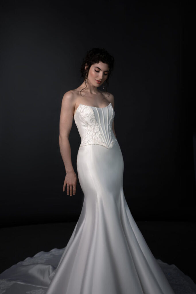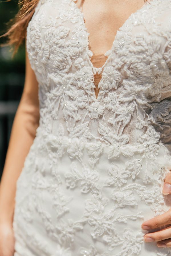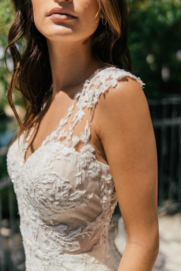 In a look of classic bridal beauty, Style 1463 radiates Old World elegance with modern sophistication in this allover lace fit-and-flare wedding gown. Lace cap sleeves add a softness to the shoulder before dipping into a plunging sweetheart neckline in the front and forming a round keyhole open back detail. Highlighting the figure throughout the hip, the allover vine lace cascades into the flared skirt and sweeping train with a glamorous undersparkle and detachable overskirt to add another layer of ethereal beauty to this timeless wedding dress.