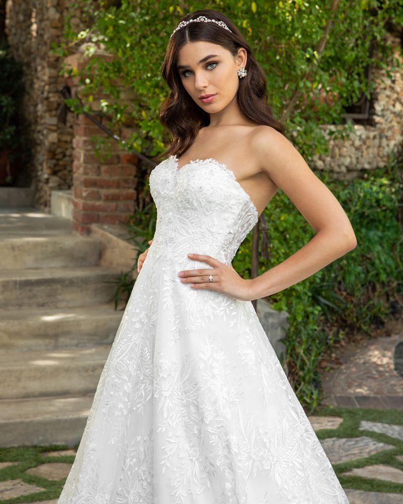 Demure and flirtatious, Style 2414 Reagan by Casablanca Bridal radiates with natural grace. Floral beaded lace covers the entire A-line silhouette of this wedding dress, blooming into a gorgeous 75” train with scalloped edges. The strapless sweetheart neckline is dotted with subtle beading detail, for a touch of sparkle, while a see-through back shows a little extra skin. This feminine, classic style is bound to please.