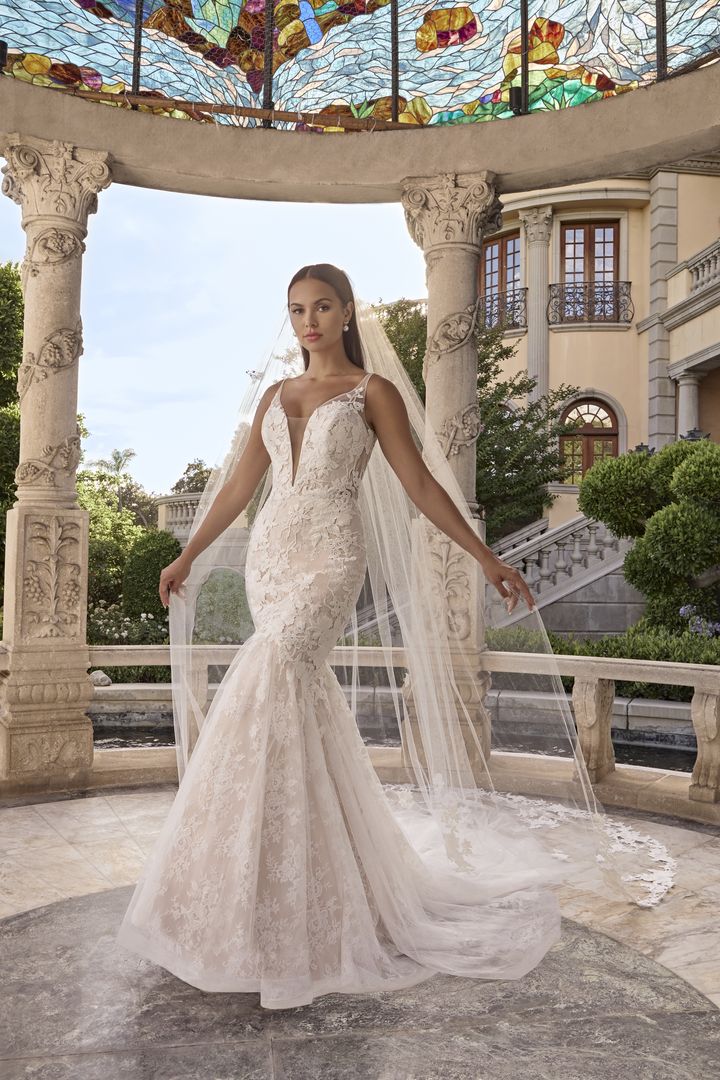 A figure-loving fit and flare in perfecting satin, shimmer tulle and Chantilly lace, Style 2499 Este by Casablanca is both a pleasure to wear and admire. Elegant and effortlessly chic floral appliques unfold in mesmerizing motifs down the entirety of this fit and flare silhouette, featuring a plunging neckline and delicate straps. Turning around, an open back adds a touch of sensuality before drawing the eye downward to a 75″ train. For a classic accompaniment, pair with Este’s matching veil 2499V. Beautiful on all figures, Este is also available in our Curvy Sample.