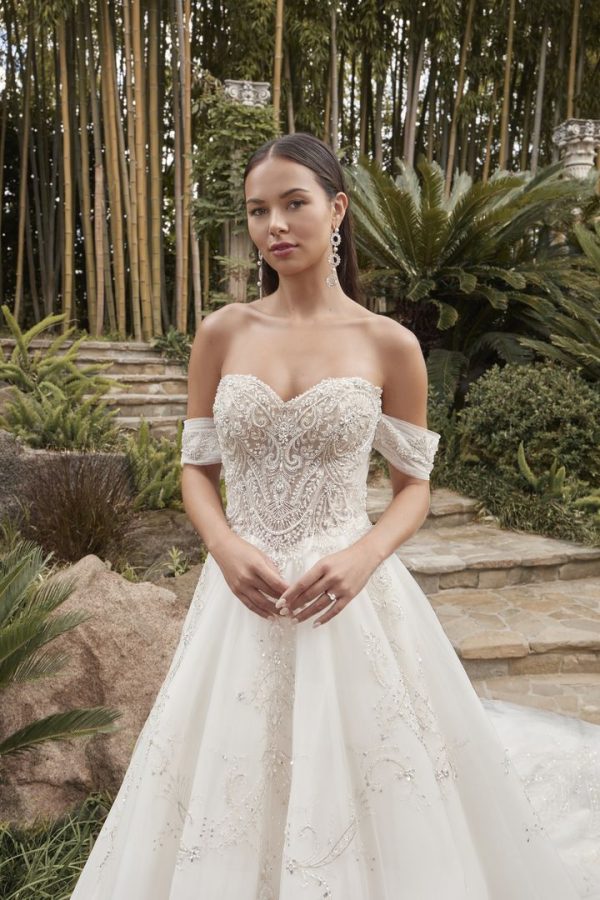 A fairytale love deserves to be celebrated with a fairytale dress, and Style 2511 Mathilda by Casablanca is fit for a princess. The fantasy begins with the sweetheart neckline and detachable off-the-shoulder straps, overflowing with sparkling beading and embroidery throughout the carefully constructed bodice, before flowing into a sparkling A-line skirt crafted from hard netting and tulle. All 85″ of this spectacular train shimmer softly for a romantic grace fit for everlasting romance. To complete the look, pair it with a matching veil 2511V.
