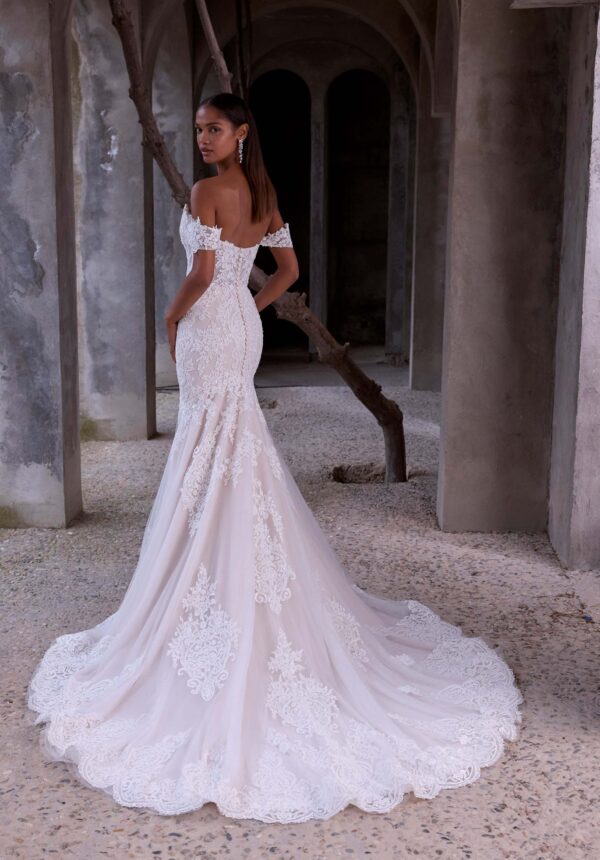 Mermaid wedding dress in corded lace has a strapless scoop neckline and detachable off-the-shoulder sleeves with princess seams and a scalloped hem.