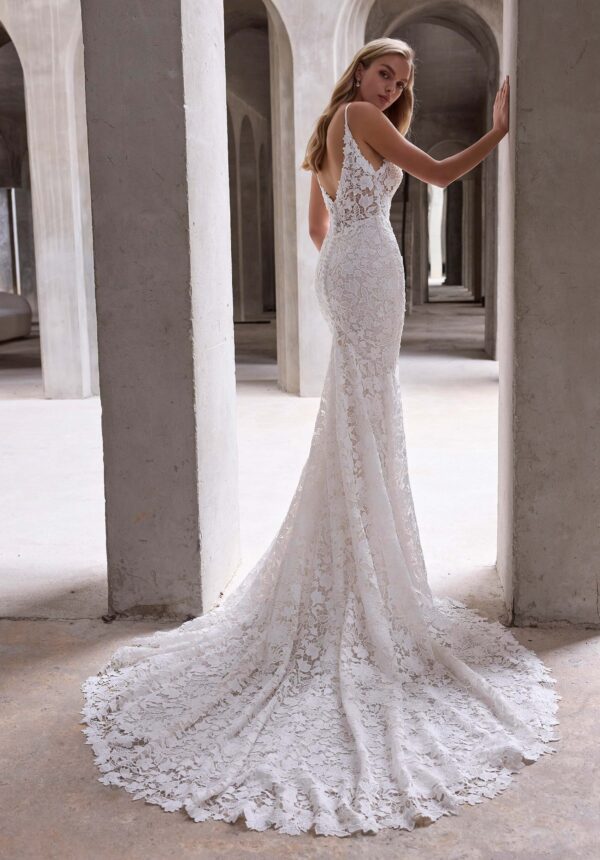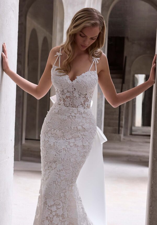Floral lace fit and flare has a stylized cat eye neckline with bow straps and open back with a detachable single loop bow.