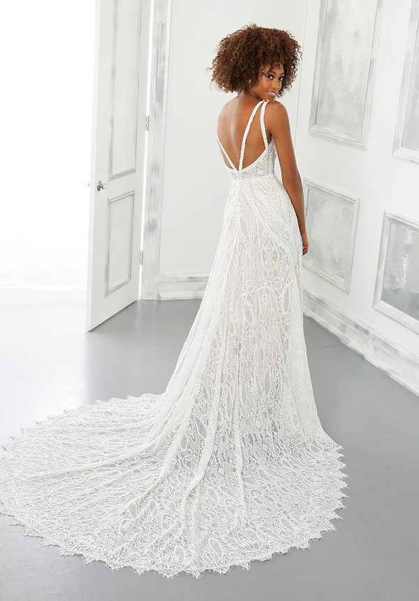 Boho A-line has intricate allover lace with braided lace trim to accentuate your figure and delicate scalloped hemline.