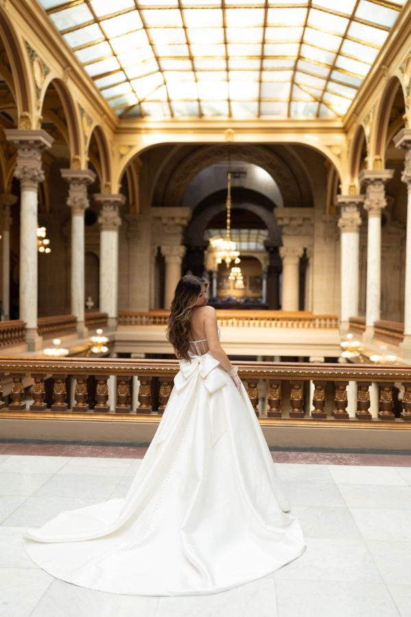 An elegant and classic ballgown is transformed into a contemporary runway-worthy wedding dress in Style 7711, constructed in luxurious Mikado and featuring modern accessories like discreet hand pockets and a dramatic bow back detail. From a scooped strapless neckline, an impeccably-tailored bodice forms a clean and chic front bodice and a sheer and extravagant back with sparkling seam work and a detachable oversized bow accent. In extravagant and royal style, this modern ballgown is made complete with its full skirt and train, and is also available in plus sizes.