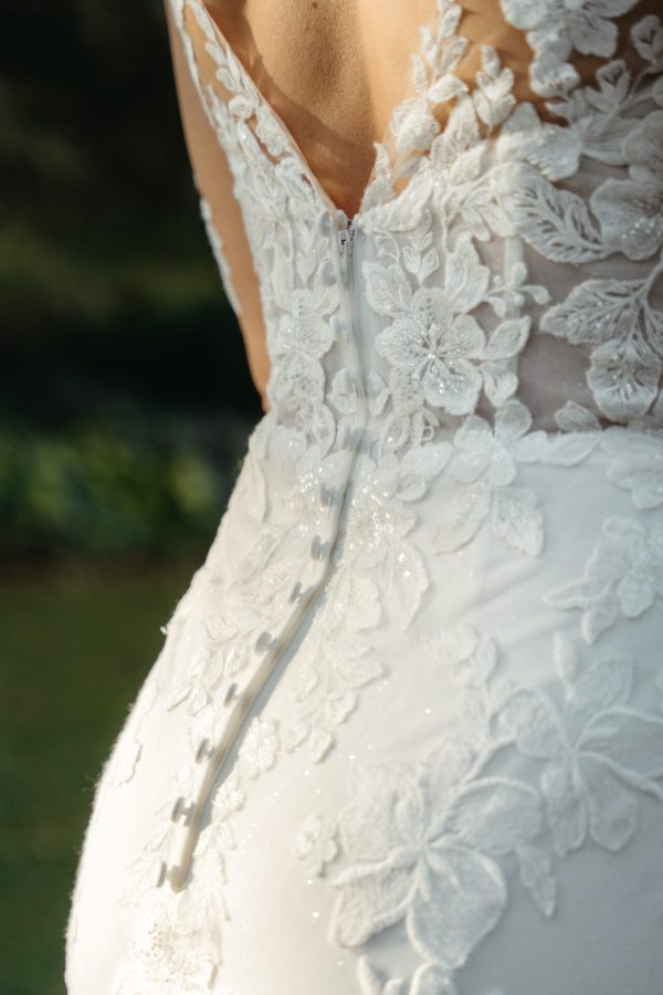 For an unforgettable wedding day look, Style 7867’s sexy fit-and-flare long-sleeve wedding dress is a design for the romantic bride. Gorgeous optional matte lace paints the skin in delicate florals with a sheer high neckline and elegant long sleeves. Beneath the illusion lies a sexy sweetheart neckline and fitted bodice with a low V-back scoop and a small row of fabric-covered buttons in the back. The stunning fit-and-flare silhouette graces every curve of the body, with 3D floral and lace appliqués exquisitely placed to create a daring and sophisticated bridal look. This gown is available with or without glitter tulle and beading.