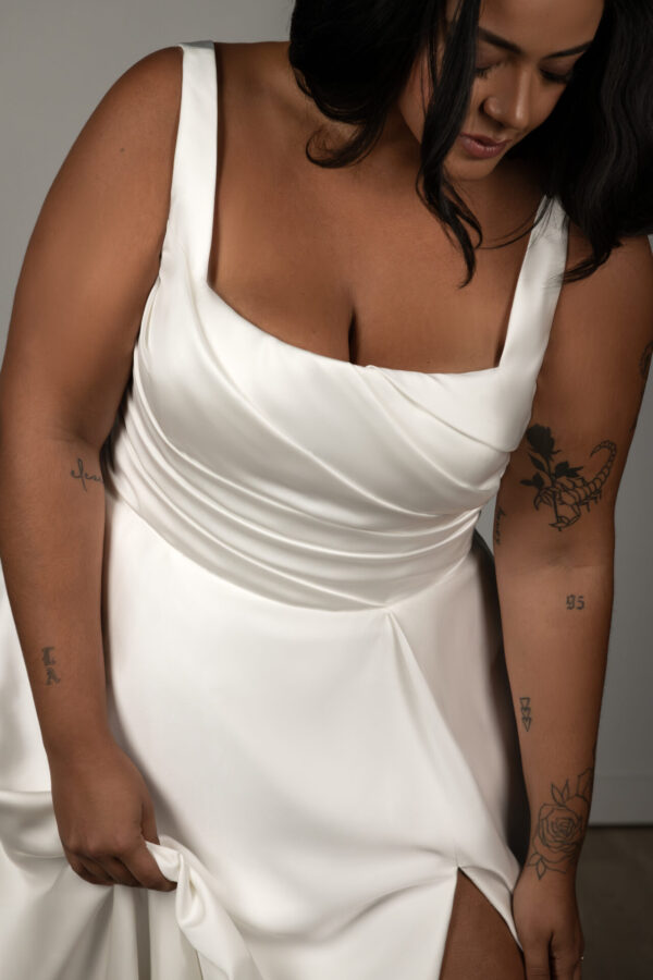 Sleek and sophisticated, Style SY8110 redefines modern bridal elegance with a stylish twist. Chic shoulder straps highlight a refined square neckline, complemented by the dreamy ruched bodice in luxurious satin for a clean, minimalist look. The softly scooped back adds an effortlessly alluring touch, while a row of fabric-covered buttons trails gracefully down the length of the skirt. A tasteful high leg slit brings a contemporary edge, enhancing the movement of the modern A-line silhouette. This gown is for the bride who embraces minimalist glamour with a touch of drama.