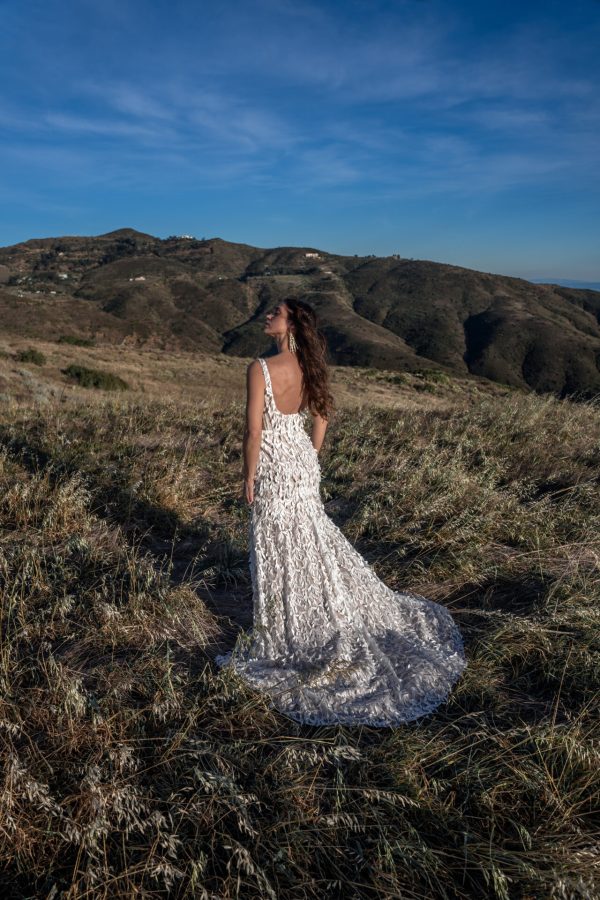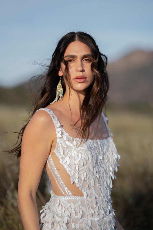 The byron gown is the definition of fierce bridal style. Designed with the adventurous bride in mind, the bold column wedding dress features a flattering square neckline, sexy side cutouts, a sheer bodice and 3D floral detailing for a flirty appeal. The gorgeous open back and simple train complete this dreamy boho wedding gown.