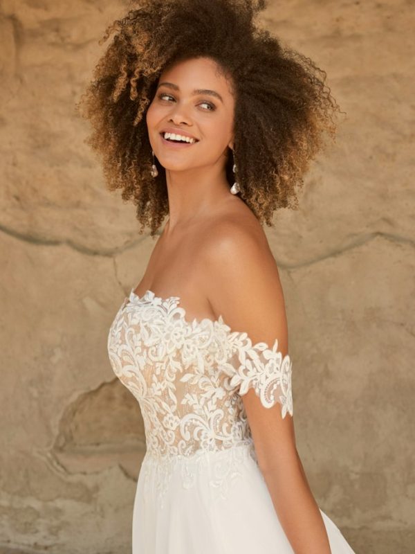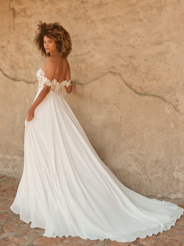 Off-the-shoulder chiffon wedding gown for beach vibes