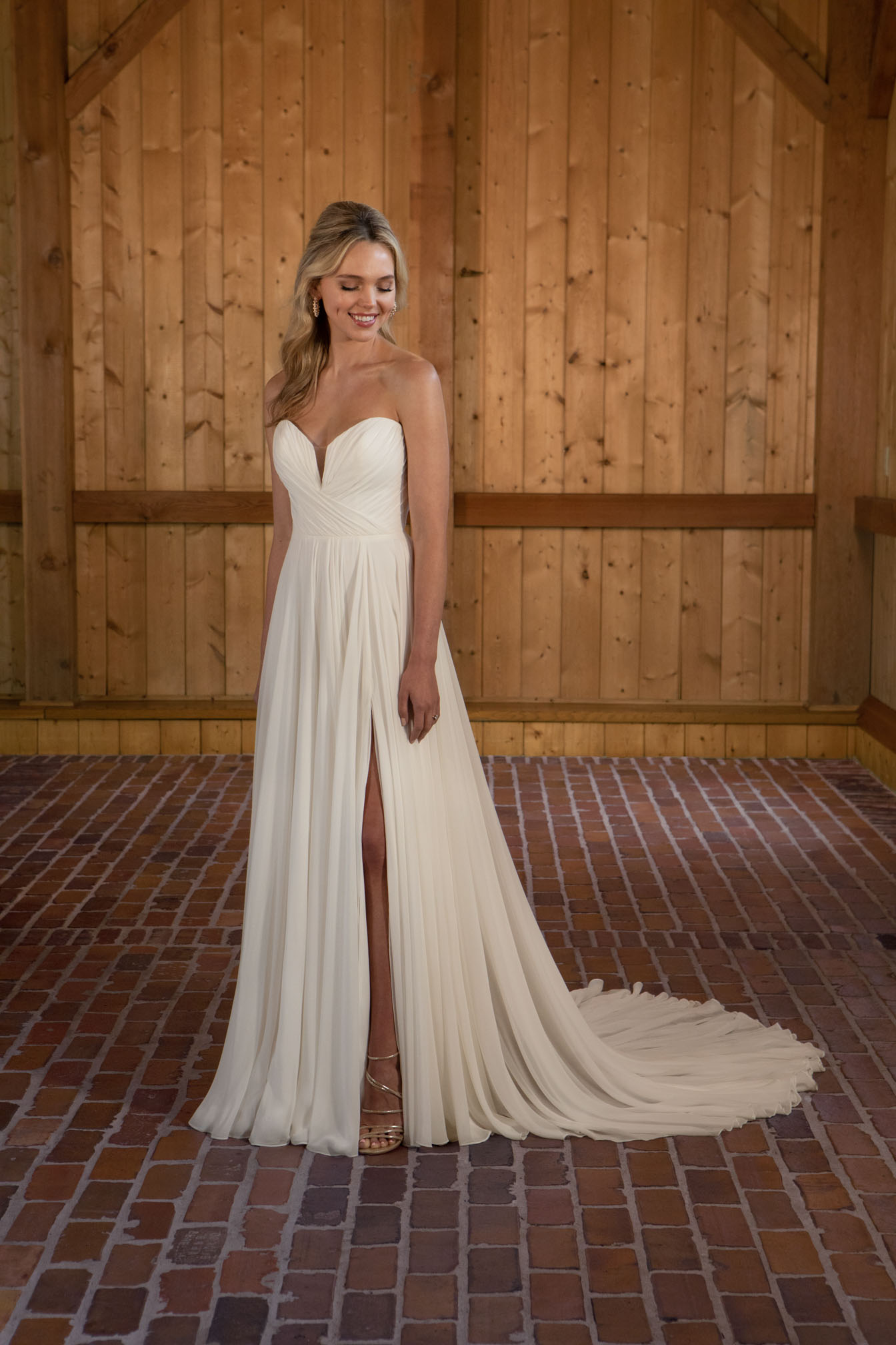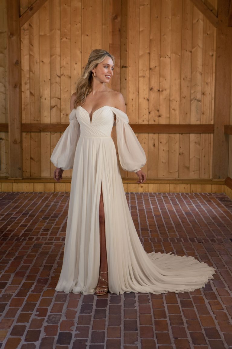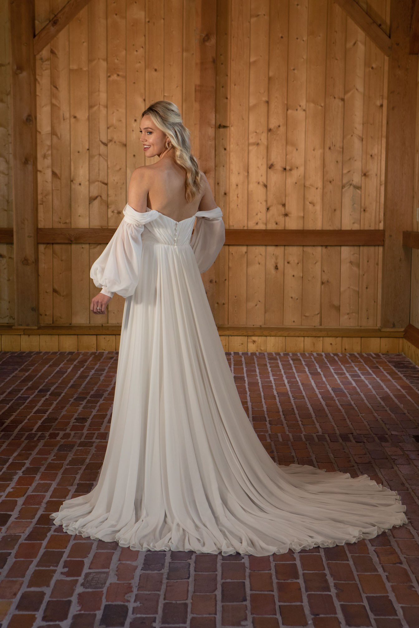 Get swept away in Style D3636, a romantic A-line wedding dress draped in soft layers of delicate chiffon. The notched plunging neckline accentuates the soft pleating of the romantic wrapped bodice. Detachable off-the-shoulder blouson sleeves add a luxe detail for this versatile wedding look, which can also be worn strapless. The clean and simple aesthetic is made complete with a soft A-line skirt that floats and sways with every movement, with a side slit detail and head-turning train.
