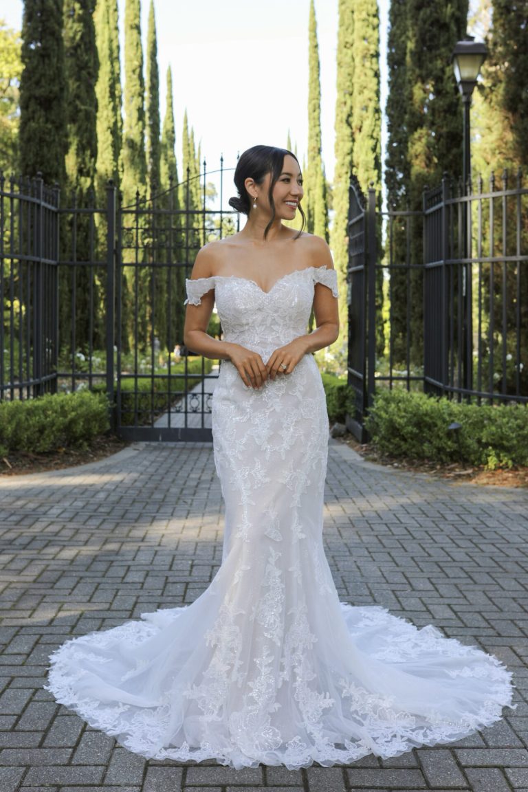 Make a memorable walk down the aisle in Style D3960 — a flattering fit-and-flare wedding gown with all the glamour and sparkling embellishments. This romantic wedding dress features off-the-shoulder straps that join the sweetheart neckline in an allover floral lace bodice embellished with glimmering sequins and beads over glitter tulle. The vintage-inspired back detail reveals a row of fabric-covered buttons from the back bodice to the hip. A fitted waist accentuates the figure then hugs the hips before flaring out into a delicate lace-embellished skirt and shaped train. This wedding gown is also available in plus sizes.