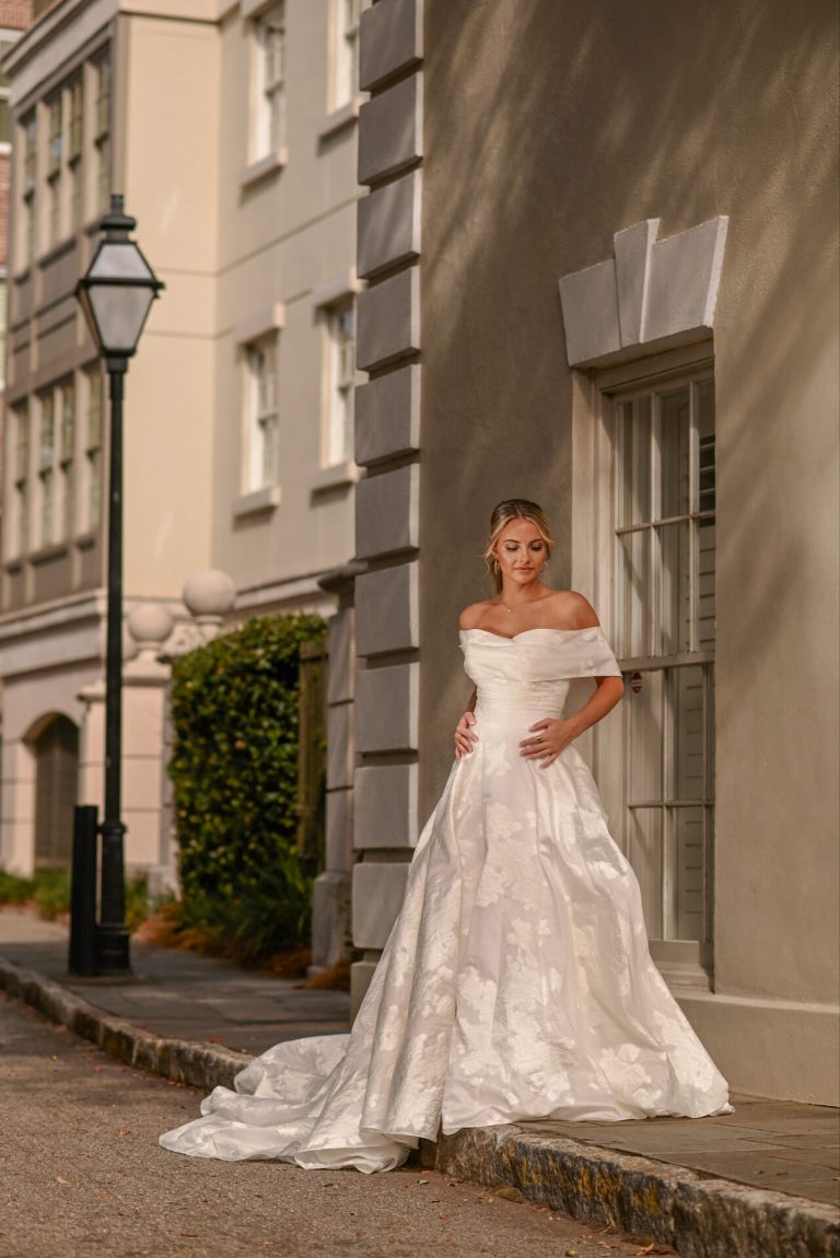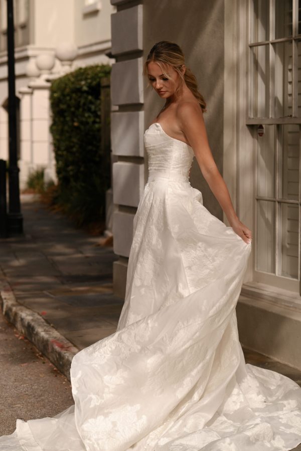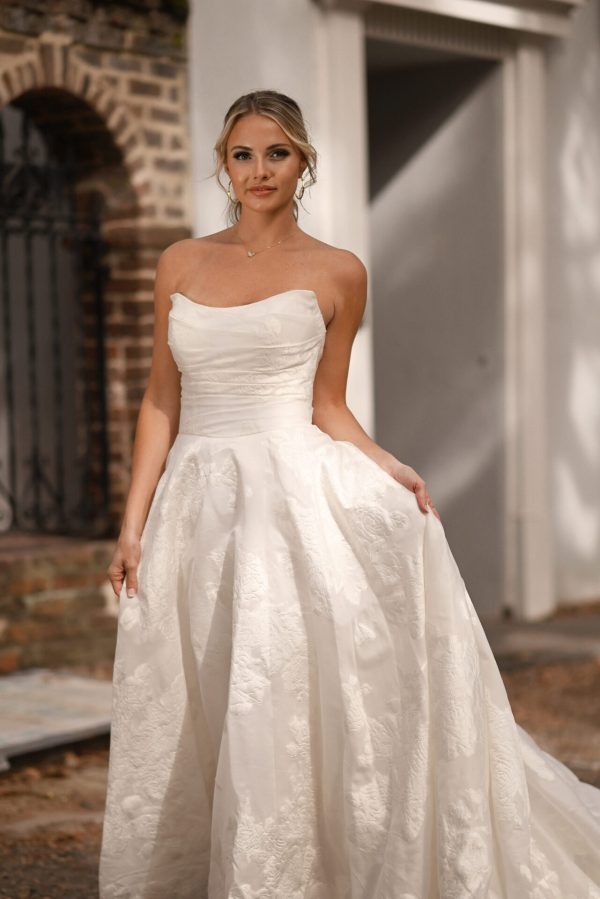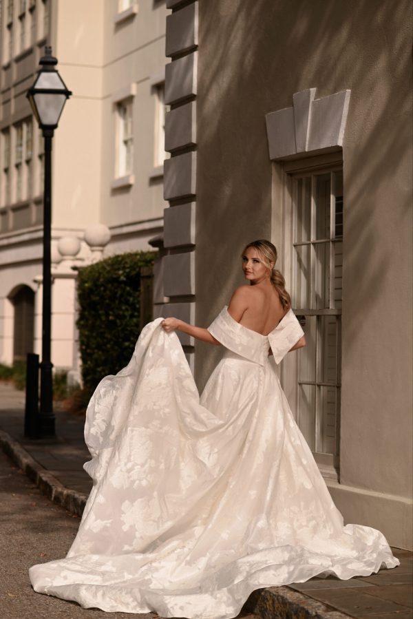 Exuding timeless elegance, Style D3971’s luxe floral-print organdy jacquard and tailored fit emanate style and sophistication. The princess ballgown features a detachable off-the-shoulder shawl that fastens atop a strapless wrapped bodice fastened by a gown-length row of fabric-covered buttons. At the waist, a full ballgown skirt flatters the silhouette and highlights the unique printed organdy jacquard. Luxurious and modest, this elegant organdy jacquard ballgown makes a luxurious fashion statement down the aisle. This regal gown is also available in plus sizes.