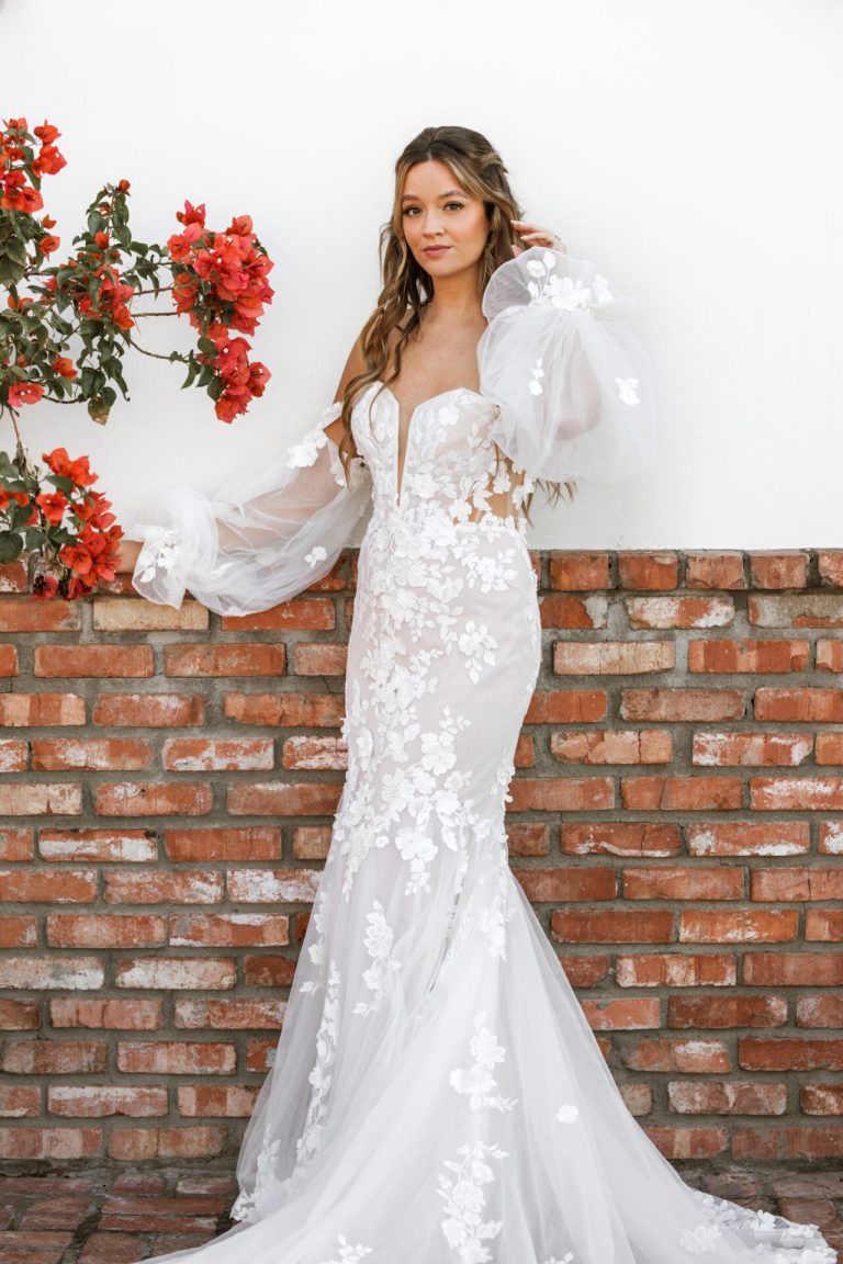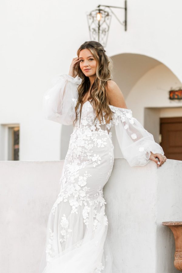 For an unforgettable bridal look, Style D4038 offers high-fashion versatility with detachable sleeves that transform this off-the-shoulder bell sleeve wedding dress into a sexy strapless lace wedding dress in moments. The sheer blouson sleeves attach to a plunging sweetheart neckline and gather at the wrist for a free-spirited flowy effect. The ultra-fitted bodice accentuates the figure with discreet side cutouts that join a mesmerizing illusion corset back sealed with a row of timeless fabric-covered buttons. Floral lace appliqués scatter across the fit-and-flare silhouette as it extends into a frothy lace-trimmed skirt and train. Made for the modern romantic, this ethereal lace wedding gown captures the timelessness of that forever romance.