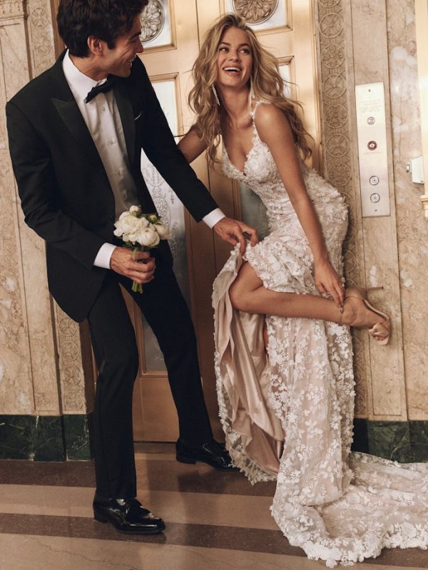A lace mermaid bridal gown in lush florals, layered illusion, and starlight sequins.