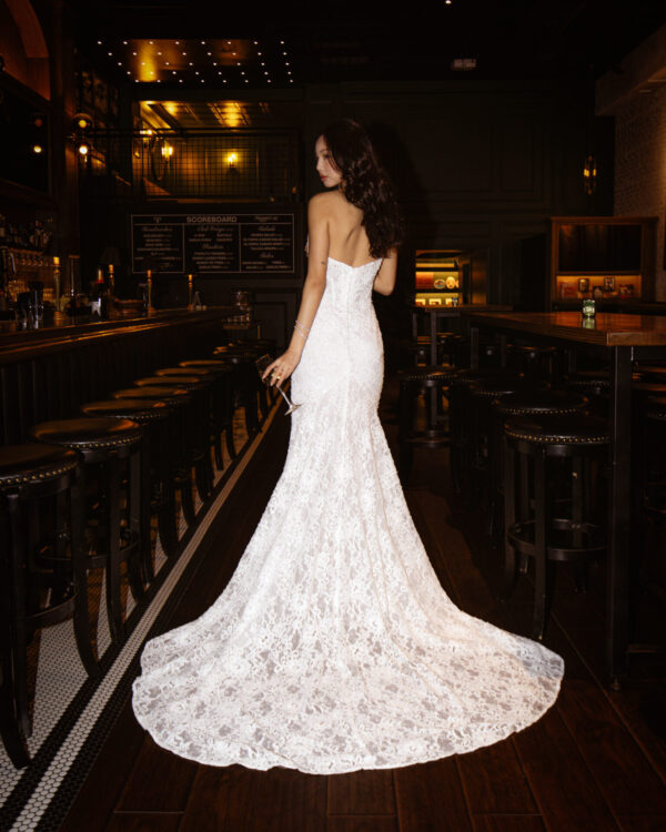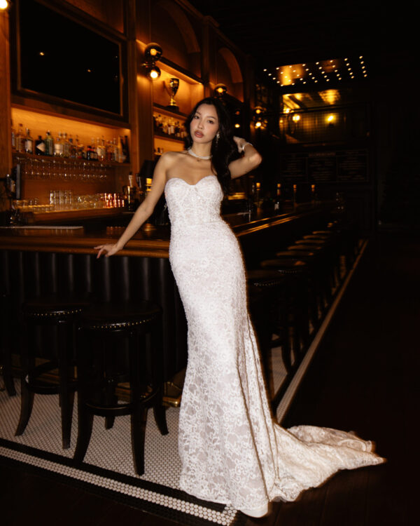Timeless elegance and contemporary sophistication meet in the margo gown, a vintage-inspired lace wedding gown that exudes unforgettable charm. The strapless sweetheart neckline and corset fit form a sculpted bodice in sheer Chantilly lace, artfully embellished with subtle sequins and pearl beads that softly shimmer with each movement. A detachable peplum waist accessory offers a versatile bridal look for the fashion-forward bride as the fitted column silhouette hugs the figure before gently flaring at the knee to complete this glamorous vintage lace wedding gown.