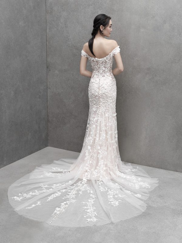 Touchable fabric blossoms lend texture and airiness to this off-shoulder sheath gown.