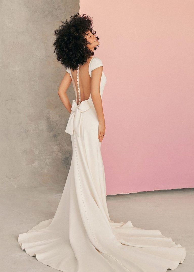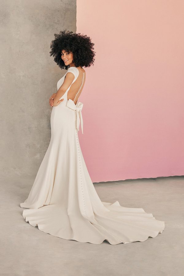 An elegant bateau neckline graces this cap sleeved minimalist sheath.