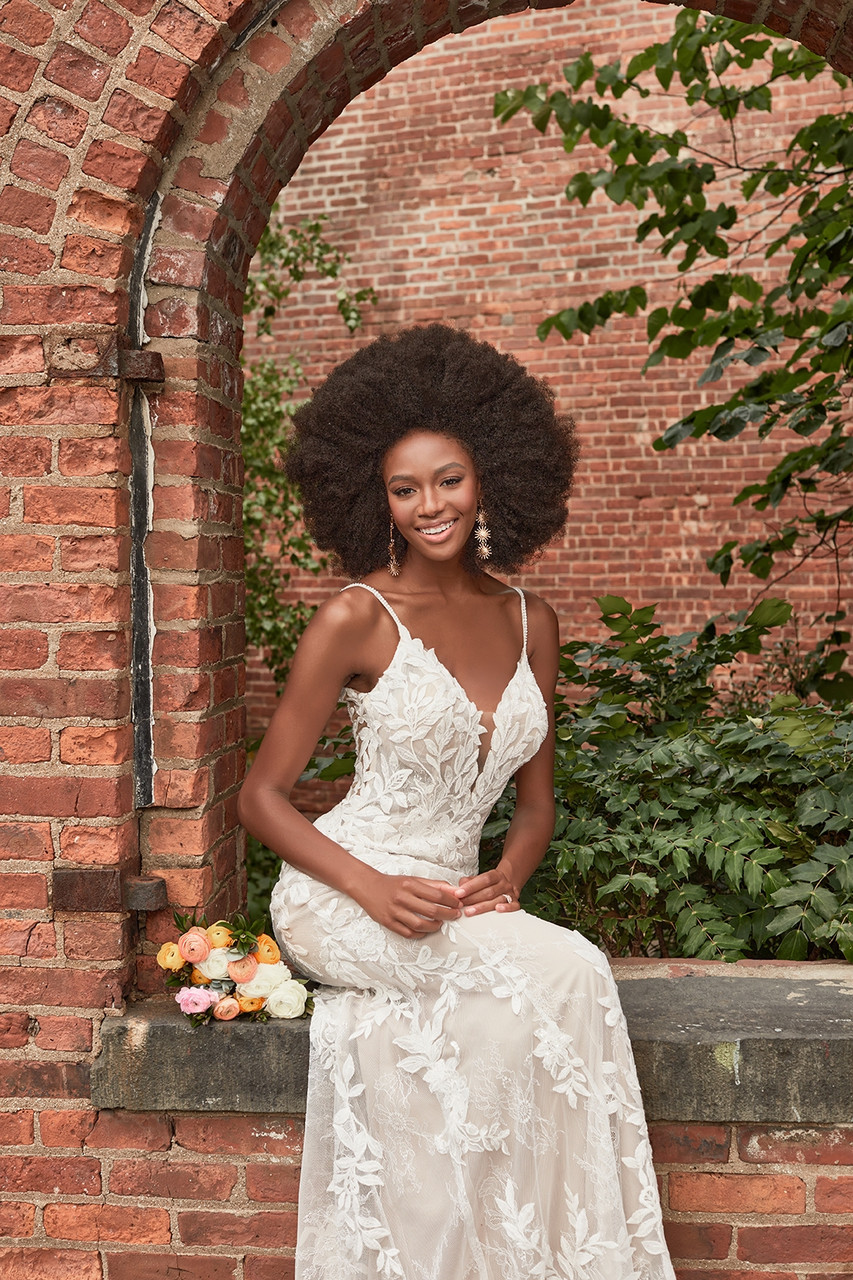 Rustling leaves and delicate branches arch across the bodice of our strappy Jordan sheath, leading to a Chantilly lace train.