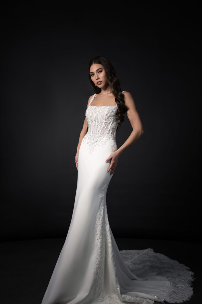 Delicate lace and intricate details define this stunning column wedding gown, bringing a touch of vintage charm to contemporary bridal fashion. Beaded spaghetti straps frame a square neckline, leading to a sheer corset bodice adorned with graphic lace appliqués that softly curve over the Basque waist. A stunning low illusion open back detail dips to the waist, showcasing a gown-length row of fabric-covered buttons. The clean and luxurious crepe fabric glides over the figure, allowing the lace accents to frame the silhouette as subtle lace appliqués scatter along the column skirt to meet a beautifully shaped lace train that cascades down the aisle for an ethereal and romantic bridal look.