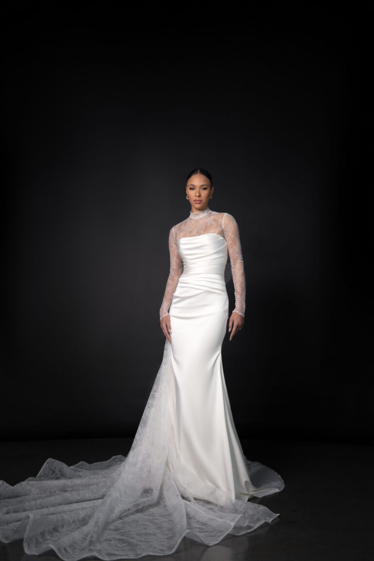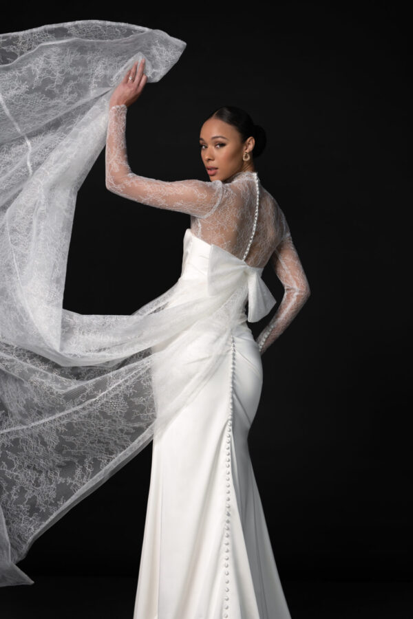 Style 1874 is a modern column wedding dress in opulent charmeuse fabric featuring a detachable long sleeve lace topper and detachable lace train. The draped strapless bodice scoops at the neckline and wraps around the figure, ending with a gown-length row of fabric-covered buttons. The detachable lace topper with an elegant high neckline adds delicate floral lace to the bodice, extending the gown-length row of fabric-covered buttons down the back. The clean and chic column silhouette ruches at the back hip before flowing into a detachable lace train that cascades from a modern bow detail to complete this modern bridal look. This gorgeous gown is also available in plus sizes.